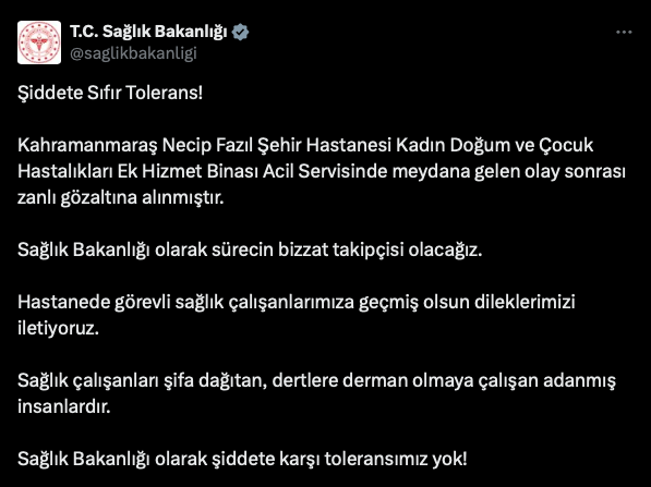 Bakanlığın toplumsal medya hesabından “Şiddete sıfır tolerans” başlığıyla yapılan açıklamada, Necip Fazıl Şehir Hastanesi Bayan Doğum ve Çocuk Hastalıkları Ek Hizmet Binası Acil Servisinde meydana gelen olay sonrası zanlının gözaltına alındığı anımsatıldı.